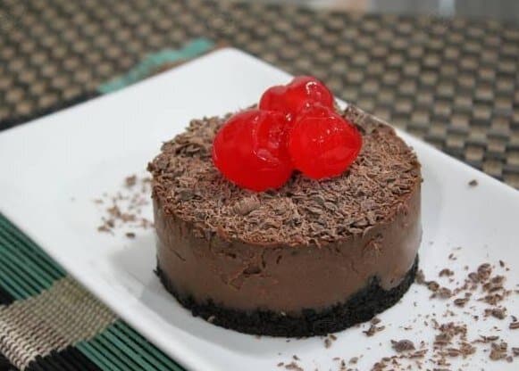- Desenforme e decore com raspas de chocolate e as cerejas. (fica mais bonito)