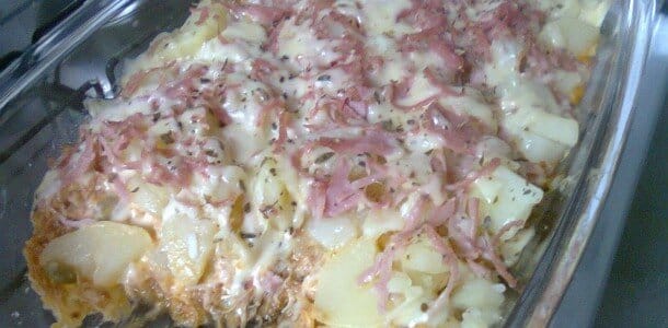 - Logo em seguida coloque o requeijão por cima do frango e depois as batatas cozidas em rodelas